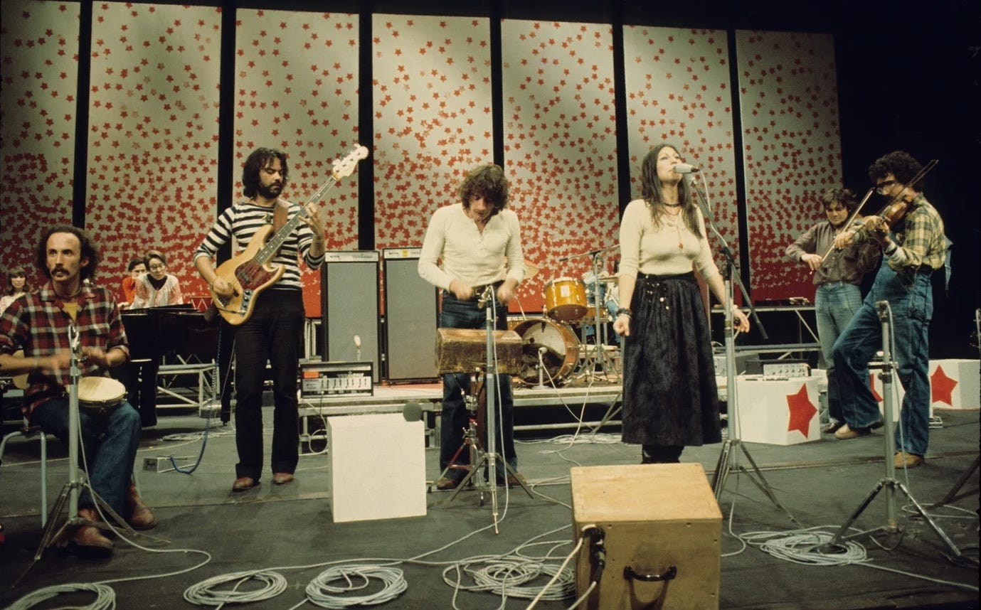 Their 1977 release Miradas is widely regarded as their defining work. The vocals have an earthy, celebratory quality that grounds the music. Folk traditions permeate all five tracks, with “Glorias” standing out for its vibrant North African influence and persistent violin motif. “Miradas” is not just a musical statement, it’s a political and philosophical intervention. The album uses music as a platform for postcolonial, Marxist, and psychoanalytic discourse, engaging with themes of liberation, identity, and resistance through both sound and supplementary texts.